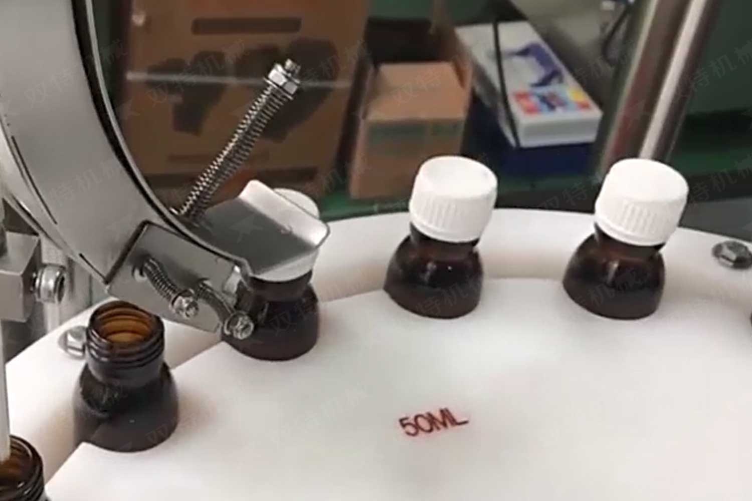 旋盖机主要用于玻璃广口瓶的三、四、六铁盖真空旋盖,用两根不同速度的皮带压瓶盖,因两根皮带的速度不同,对盖进行搓盖收紧达到旋盖目的。在自动上盖之前对瓶口吹蒸汽加热,吹掉冷空气,换上高温蒸汽,立即旋盖,根据热胀冷缩原理,蒸汽冷下来就自然形成了瓶内真空,达到了真空旋盖的目的。自动旋盖机可以和浓酱灌装机、蜂蜜灌装机、辣椒酱灌装机组合在一起,形成一套全自动灌装设备,是现代调味品企业的得力帮手。